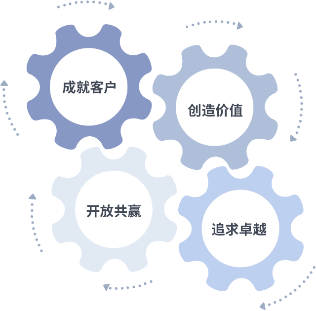 成就客户是一切决策的出发点,,,创造价值是衡量所有工作的标准,,,,追求卓越是我们做事做人的态度,,,开放共赢是我们的格局也是最终的结果。。。价值观的齿轮环环相扣,,,推动着组织里的每个人不断向前。。。
